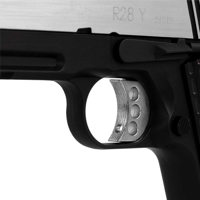 A Pistola 1911 R28 Y Dual Tone possui uma velocidade de 320fps - 98m/s com BBs .20g 6mm