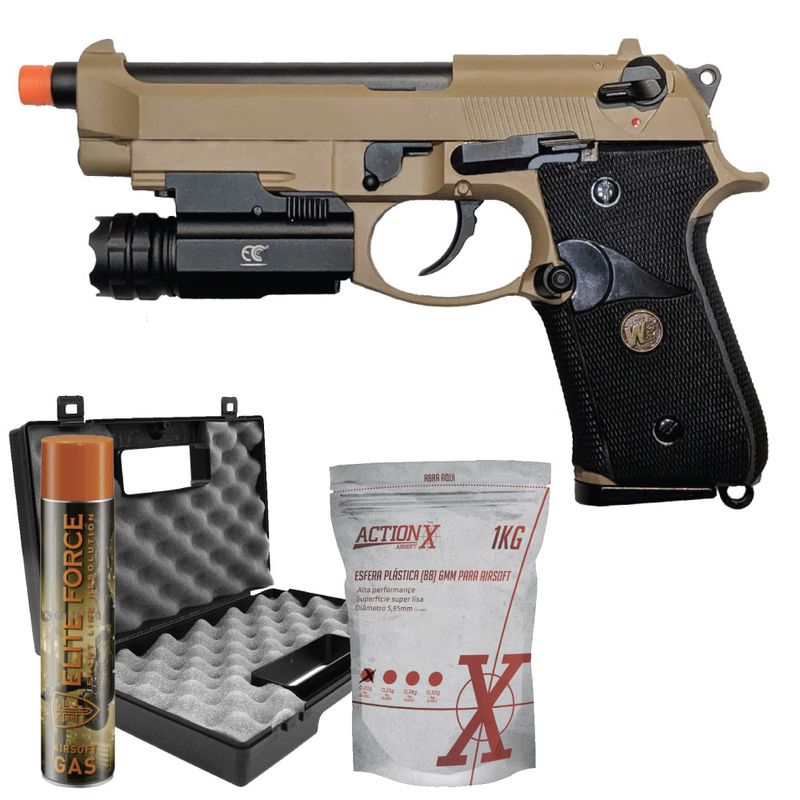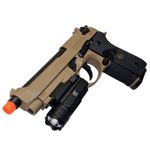 A Pistola Airsoft Beretta M92 TAN Lanterna Tática GBB Metal dispara no modo Semi Automática com velocidade de 350fps - 107m/s e energia de 114 Joules Ver mais