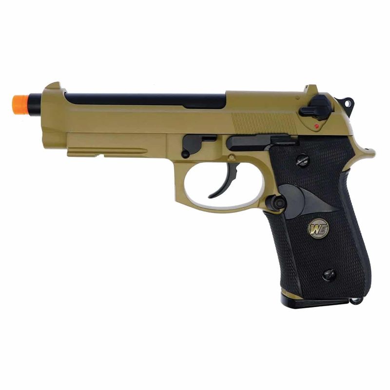 A Pistola Airsoft WE M92 TAN GBB é uma pistola airsoft que utiliza Green Gás e possui função blowback, com todas as travas funcionais e fabricada toda em metal. Possui uma empunhadura confortável e emborrachada, dando maior estabilidade nos disparos.