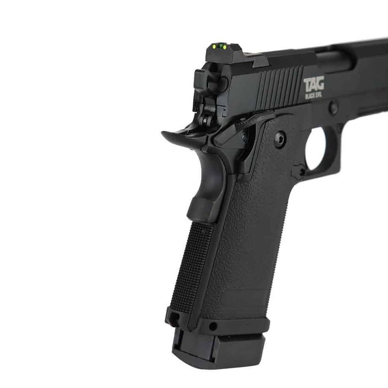 A TAG Black Evil é uma pistola leve, eficiente, ambidestra na trava de segurança e com design imponente, perfeita como arma secundária para ambientes CQB ou médio alcance.