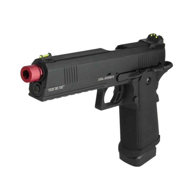 A gama de pistolas 1911 da TAG consiste em quatro versões com variações de cor e estilo. Esta é a versão Hi-Capa 5.1 Black Evil, equipada com sistema blowback realista, excelente acabamento em metal e funcionamento com Green Gás.