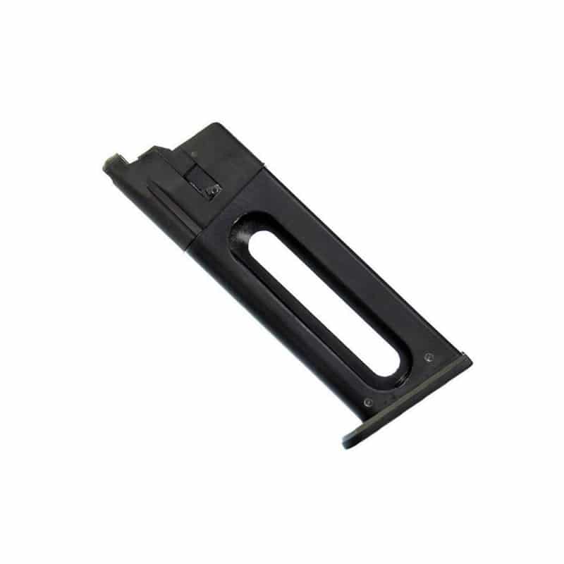 A potência é de até 1,86 Joules. A massa e alça são fixas e garantem que a mira seja rápida e fácil. Neste modelo, o cilindro de CO2 12g está alojado no carregador, que comporta até 21 BBs de 6mm.