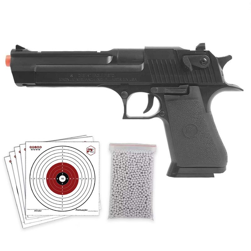 A Pistola Airsoft Desert Eagle .50AE BAX Black Spring 6mm + BBs dispara no modo Repetição com velocidade de 230fps - 70m/s e energia de 3 Joules Ver mais