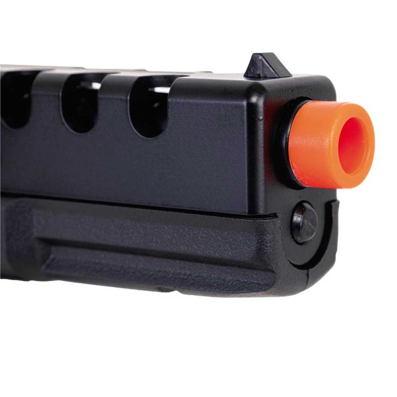 Essa pistola é extremamente realista, tendo todas as travas funcionais e ação blowback, onde o ferrolho vai para trás a cada disparo e parando aberta quando acabam as BBs de 6mm airsoft, simulando bem o movimento que a arma faz em relação a uma versão real, de arma de fogo.