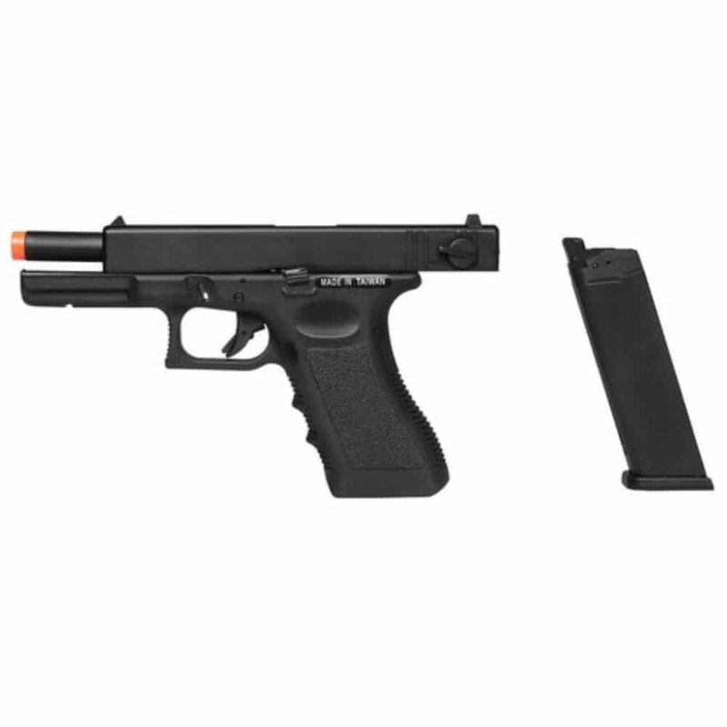 Além disso, a G18C da KSC possui trilho inferior de 22mm, capacidade de 23 BBs, peso equilibrado de 720g e alcance efetivo de até 20 metros com precisão satisfatória para combates próximos.