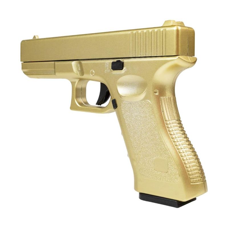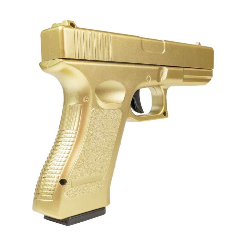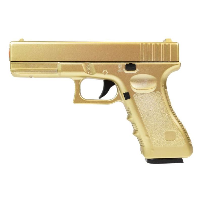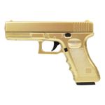 A Glock G17 Gold Airsoft Spring possui um design ergonômico adequado para usuários destros e canhotos. Conta com Slide/Ferrolho em metal e corpo em polímero de alta rigidez e conforto, conferindo maior robustez e um peso equilibrado de 400g, proporcionando uma excelente sensação de realismo.