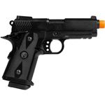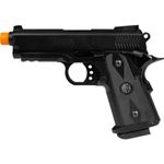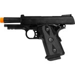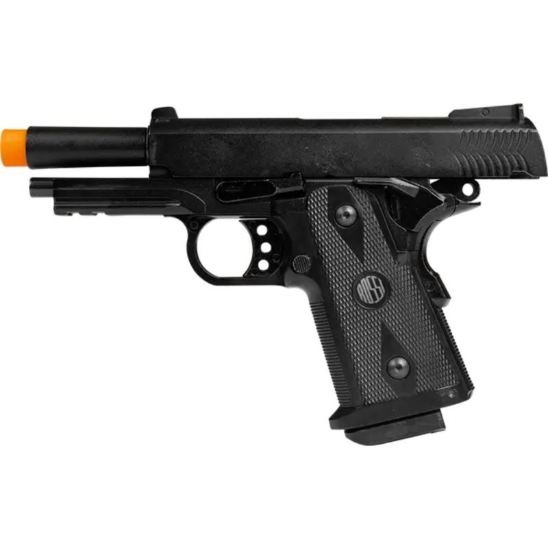 A pistola Rossi Hi-Capa Short é alimentada por Green Gas, proporcionando disparos consistentes e suaves. Seu *trilho Picatinny de 22mm* permite a instalação de acessórios como lanternas e lasers, expandindo suas possibilidades em jogo.
