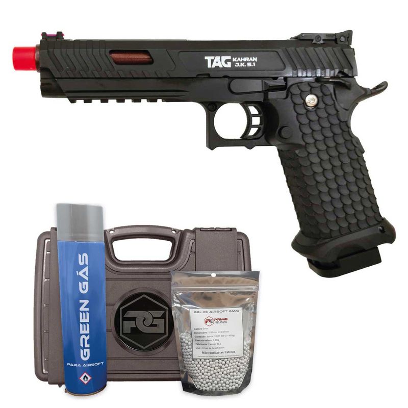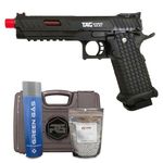 Com uma excelente velocidade de 380fps (115m/s), a TAG Kahran Hi-Capa 5.1 oferece rendimento de aproximadamente 30 disparos por carga de Green Gás e energia de 1,3 joules — com ótima precisão para até 15 metros.