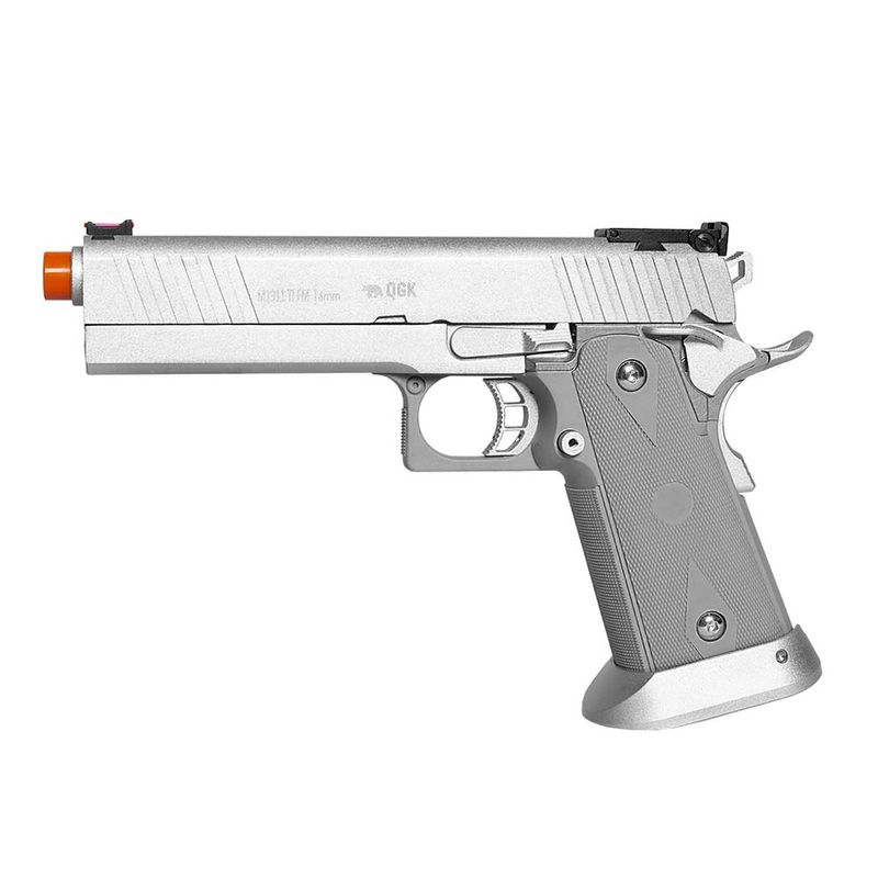 A Pistola de Airsoft a Gás GBB Green Gas M1911 TI Full Metal Blowback 6mm - QGK é uma arma de airsoft de alta qualidade projetada para proporcionar uma experiência de tiro realista e autêntica.