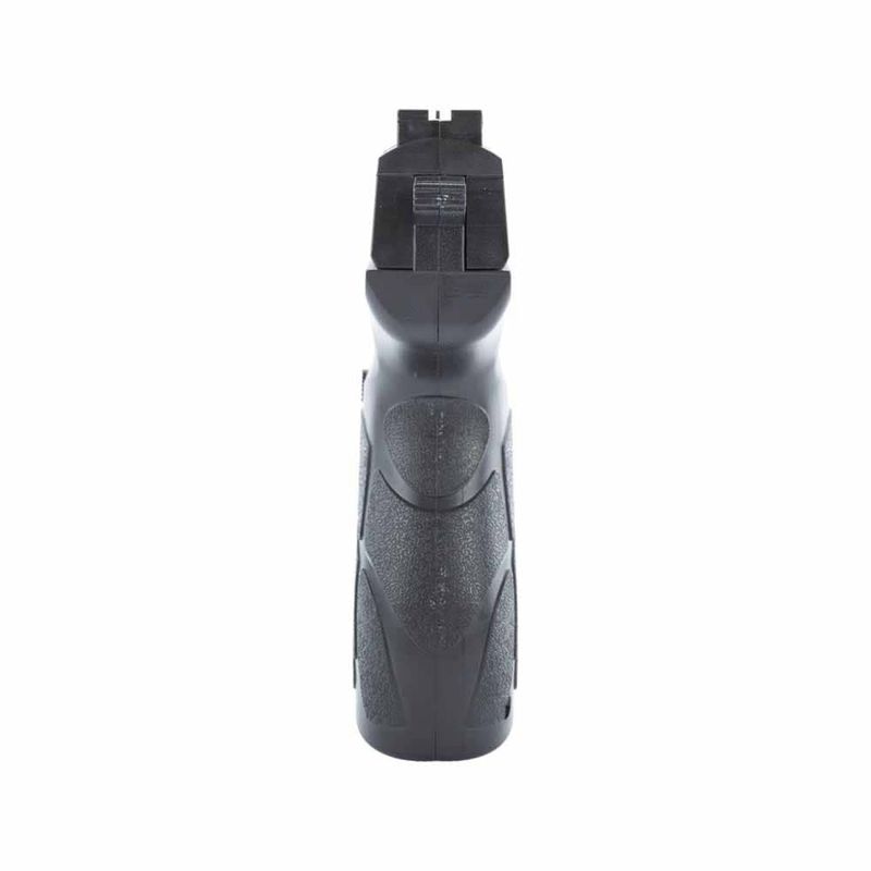 A pistola possui uma texturização em sua empunhadura e detalhes no slide em polímero.