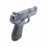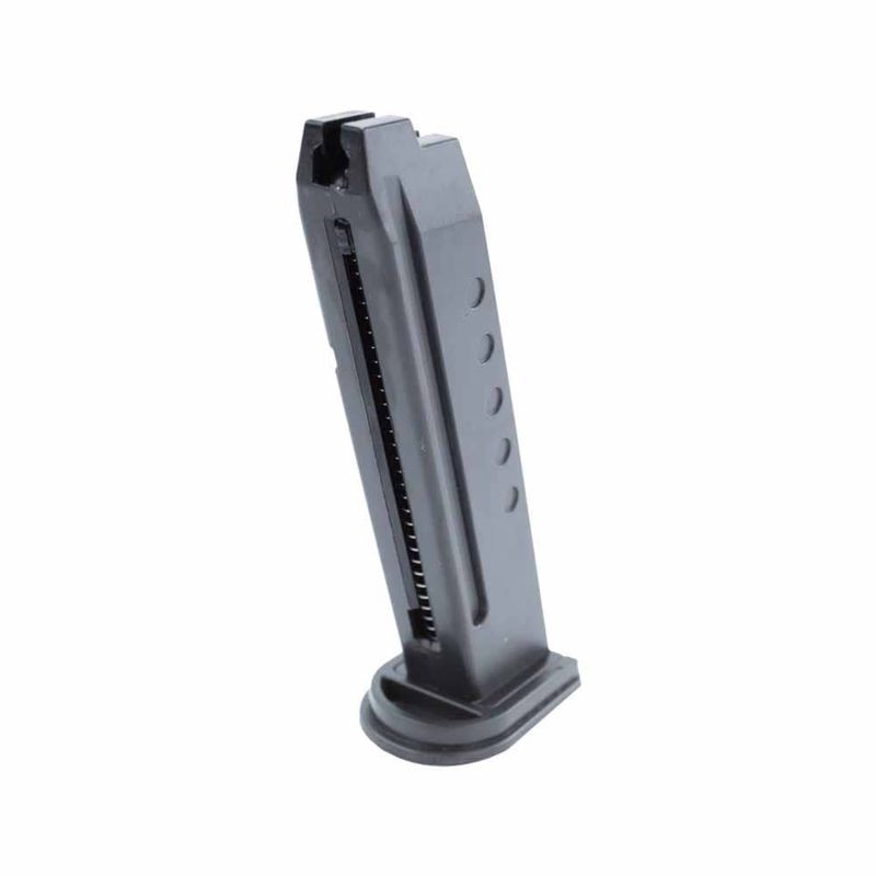 O magazine da pistola possui capacidade para 13 BBs 6mm, também confeccionado em polímero. O conjunto de mira é composto por alça e massa de mira fixas em polímero.