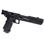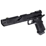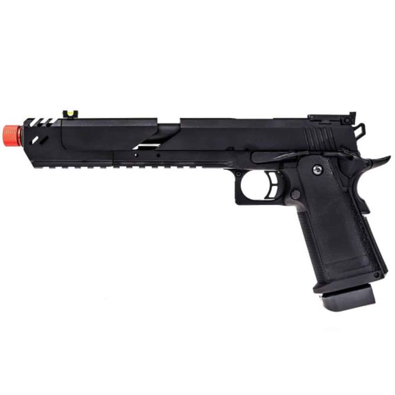 Com comprimento de 310 mm e um peso de 965 g, a Rossi 1911 Hi-Capa 7.0 Speed Dragon é imponente em tamanho, mas oferece uma empunhadura confortável, com um grip ergonômico texturizado que garante firmeza e controle durante o uso. O trilho de 20 mm no frame permite a personalização com acessórios como lanternas táticas e miras a laser, tornando-a versátil para diferentes estilos de jogo.
