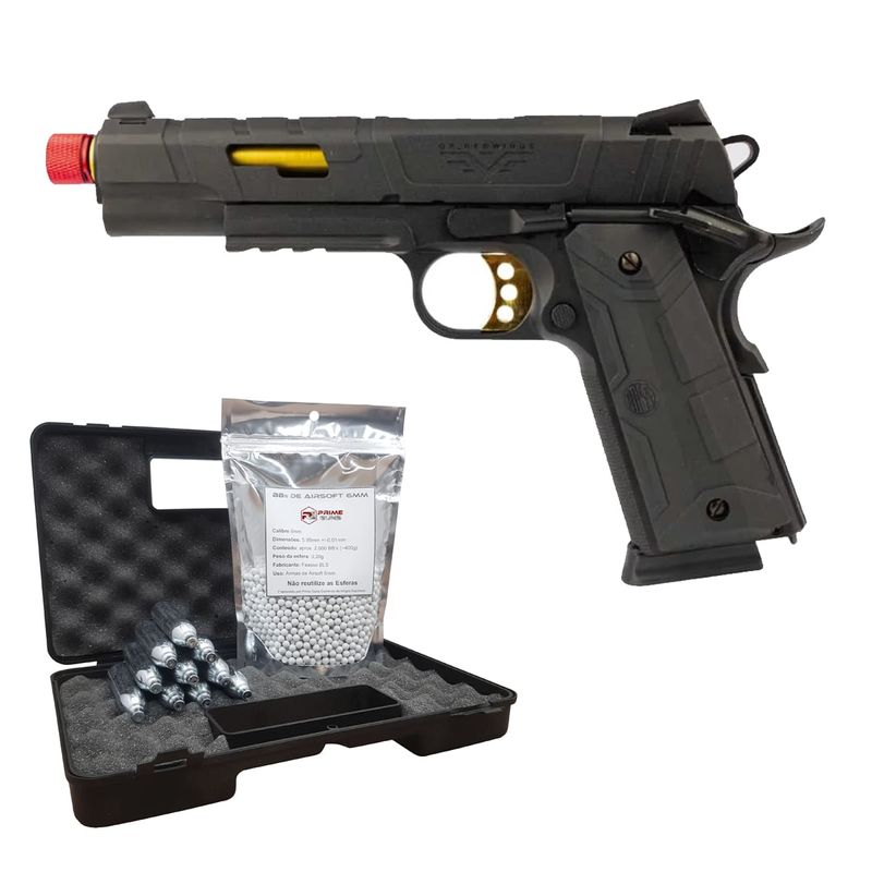 A Pistola Airsoft Rossi Red Wings 1911 Gold Co2 Blowback Kit dispara no modo Semi Automática com velocidade de 380fps - 116m/s e energia de 1,4 Joules Ver mais