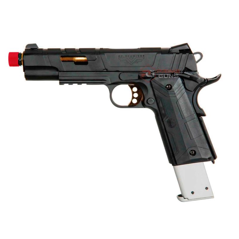 O design moderno e agressivo da pistola Red Wings é um verdadeiro charme. O contraste das cores e formatos dessa 1911 é um grande diferencial frente a outras pistolas GBB por Co2.