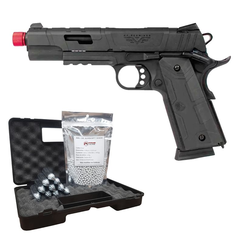 A Pistola Airsoft Rossi Red Wings Black Co2 1911 Blowback Kit dispara no modo Semi Automática com velocidade de 380fps - 116m/s e energia de 1,4 Joules Ver mais