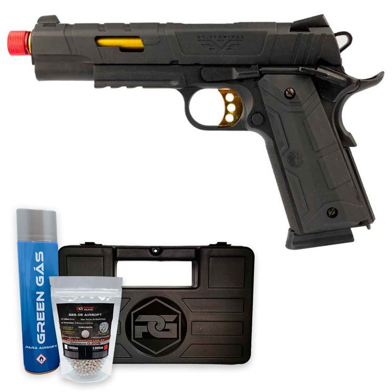 O design moderno e agressivo da pistola RedWings é um verdadeiro charme. O contraste das cores e formatos dessa 1911 são um grande diferencial frente a outras pistolas GBB.