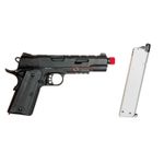 Modelo: 1911 Tipo: GBB Cor: preto Hop-up: Sim, ajustável Propulsão: Green Gás Velocidade de saída: 300FPS com BBs 0,20g Material: Fibra de Nylon / Alumínio Calibre: 6mm Peso: 776gr Comprimento: 238 mm Comprimento do cilindro interno: 112 mm Diâmetro interno: 6,03 mm Diâmetro externo: 8,55 mm Barril interno da janela: GBB Marui Modo de disparo: segurança + semi auto Blowback: Sim Choque de recuo: Sim Bolt Catch: Sim Quantidade / rodadas: 24 rodadas Capacidade: HiCap Compatibilidade da marca: Tokyo Marui, KJW Ponta: 14mm negativo (CCW) compatível comsilenciadores Prime Guns Ambidestro: Só a trava de segurança