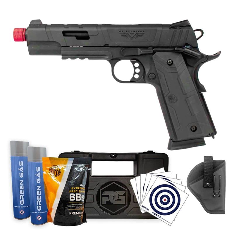 A Pistola Airsoft Rossi RedWings Black 1911 GBB Blowback Super Kit dispara no modo Semi Automática com velocidade de 300fps - 91m/s e energia de 0,9 Joules Ver mais
