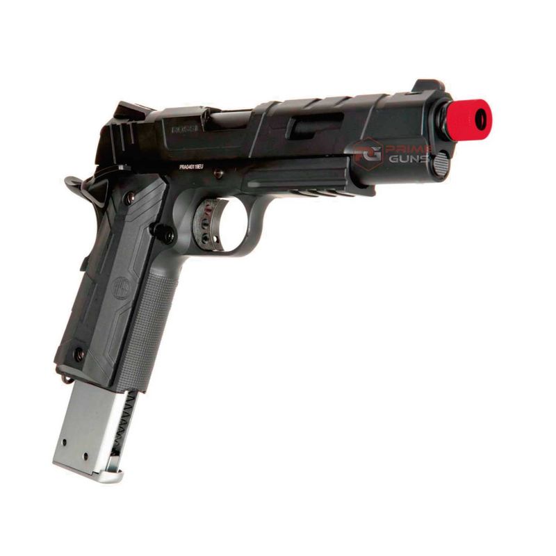 Modelo: 1911 Tipo: GBB Cor: Preto Hop-up: Sim, ajustável Propulsão: Green Gás Velocidade de saída: 300FPS com BBs 0,20g Material: Fibra de Nylon / Alumínio Calibre: 6mm Peso: 776g Comprimento: 238mm Comprimento do cilindro interno: 112mm Diâmetro interno: 6,03mm Diâmetro externo: 8,55mm Barril interno da janela: GBB Marui Modo de disparo: Segurança + Semi Auto Blowback: Sim Choque de recuo: Sim Bolt Catch: Sim Quantidade / rodadas: 24 rodadas Capacidade: HiCap Compatibilidade da marca: Tokyo Marui, KJW Ponta: 14mm negativo (CCW), compatível com silenciadores Prime Guns Ambidestro: Só a trava de segurança