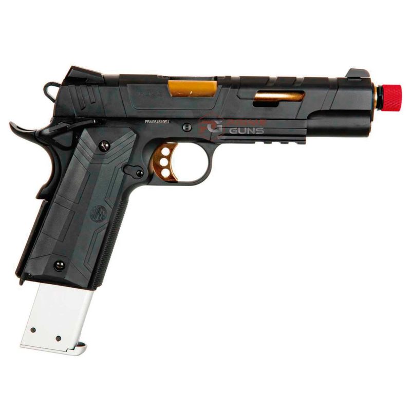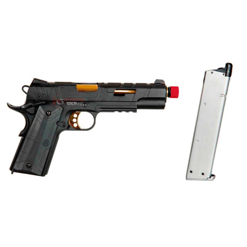 A Pistola Airsoft Rossi RedWings Gold 1911 GBB Blowback dispara no modo Semi Automática com velocidade de 300fps - 91m/s e energia de 0,9 Joules Ver mais