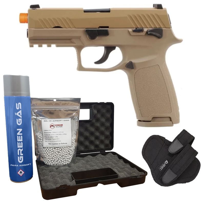 A Pistola Airsoft Sig Sauer P320 F18 TAN Metal Slide WE 6mm + Coldre dispara no modo Semi Automática com velocidade de 328fps - 100m/s e energia de 12 Joules Ver mais