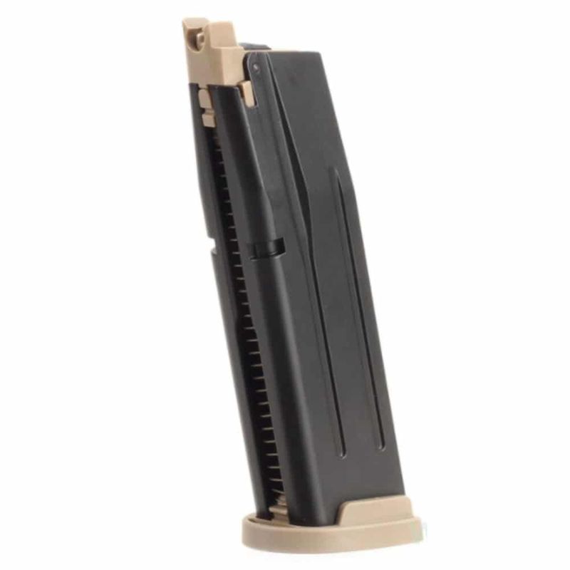 O magazine da pistola Sig Sauer P320 Airsoft da WE possui capacidade para 20 esferas de plástico 6mm.