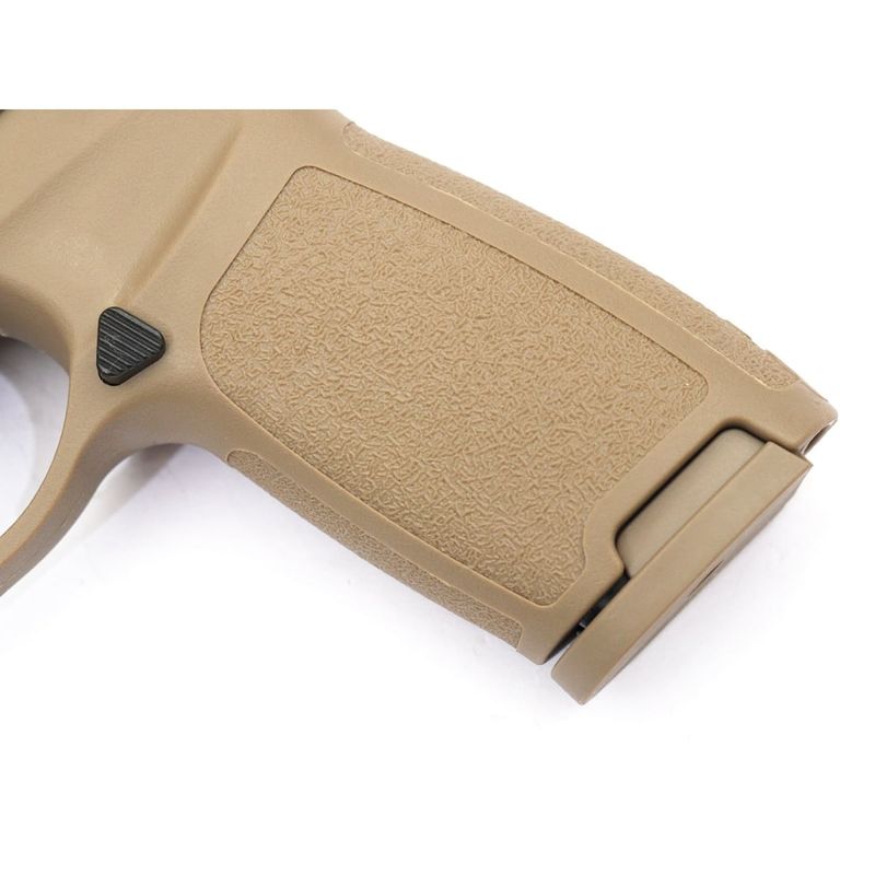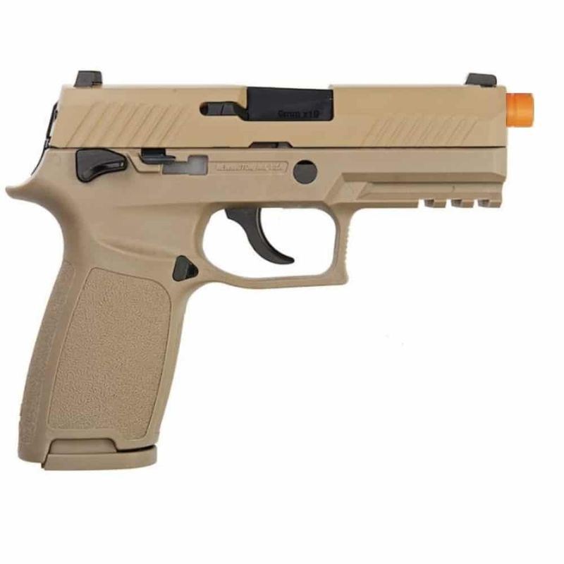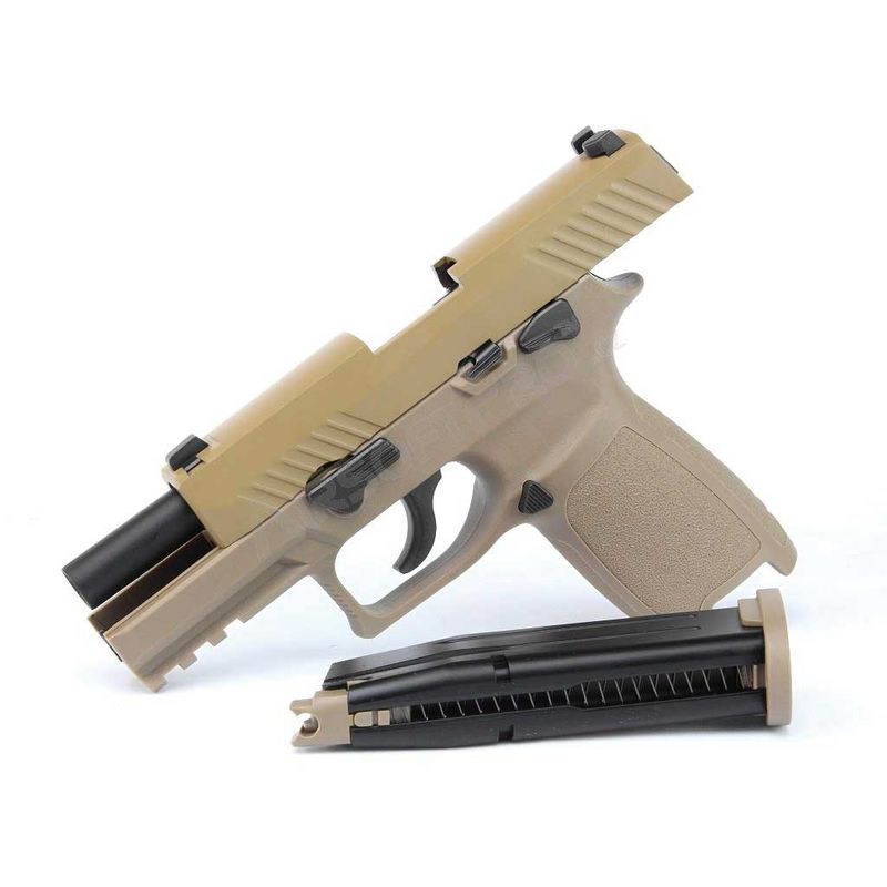 A Pistola Airsoft Sig Sauer P320 F18 TAN Full Metal Slide WE 6mm é uma pistola GBB (Green Gás Blowback) com ferrolho de metal e frame em polímero reforçado, fiel à versão real, garantindo funcionalidade e dimensões compactas.