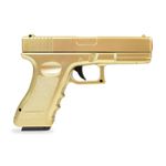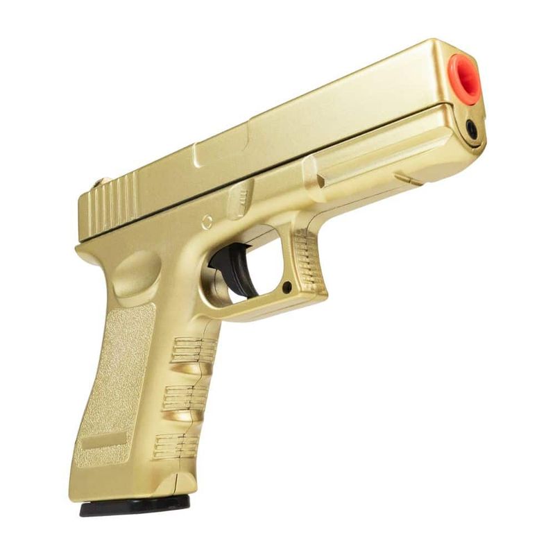 A Glock G17 Gold Airsoft Spring possui um design ergonômico adequado para usuários destros e canhotos. Conta com Slide/Ferrolho em metal e corpo em polímero de alta rigidez e conforto, conferindo maior robustez e um peso equilibrado de 400g, proporcionando uma excelente sensação de realismo.