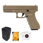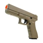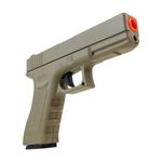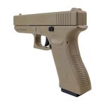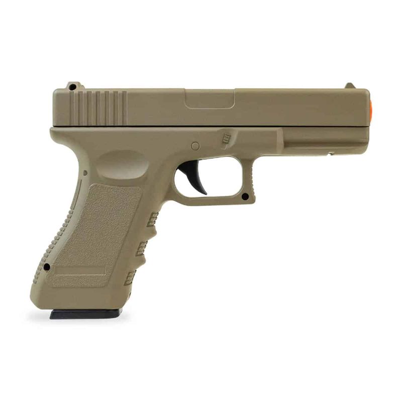 A Glock G17 Marrom Airsoft Spring tem um design ergonômico, adequado tanto para usuários destros quanto canhotos. Possui slide/ferrolho em metal com corpo e carregador em polímero de alta rigidez e conforto, o que confere à arma maior robustez e um peso equilibrado de 400g, oferecendo ao usuário uma sensação realista. A configuração de construção e materiais empregados na parte externa é fiel à Pistola Glock real.
