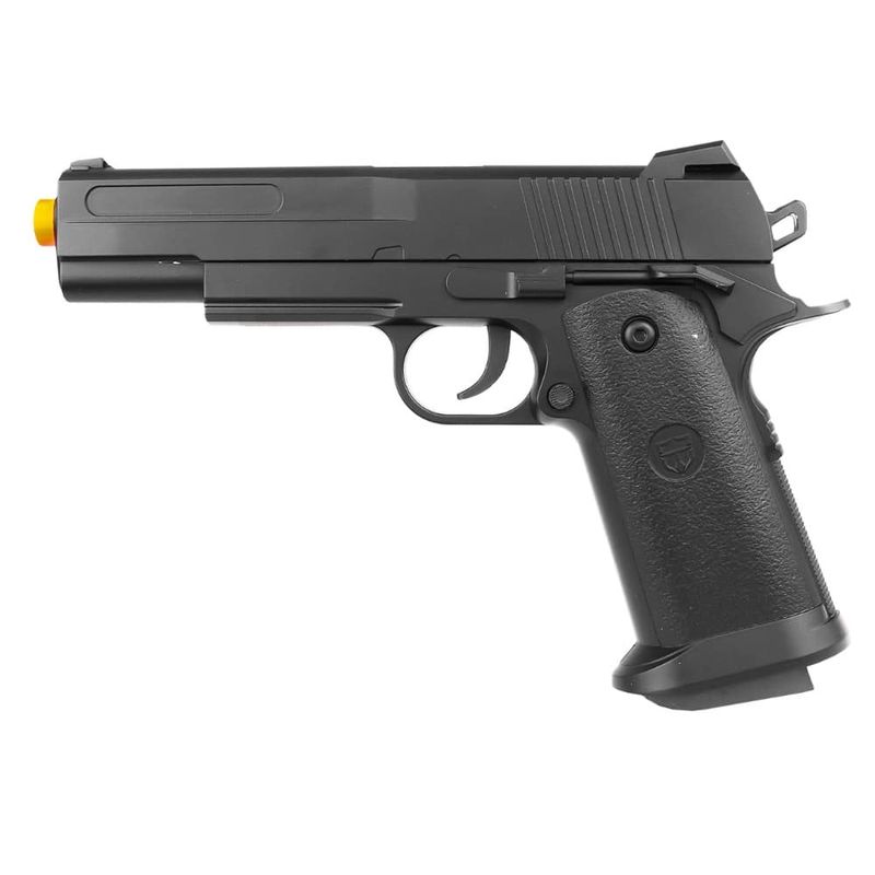 A 1911 Airsoft Spring Mola 6mm possui excelente acabamento e montagem. Possui Slide/Ferrolho em metal, com corpo e carregador em polímero de alta rigidez e partes metálicas, o que confere à arma de pressão maior mobilidade e um peso equilibrado de 680g.