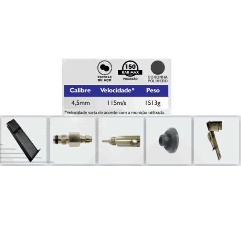 A Pistola Ar Pré Comprimido PCP P45 Airgun Rossi Kit dispara no modo Semi Automática com velocidade de 375fps - 114m/s e energia de 1,2 Joules Ver mais