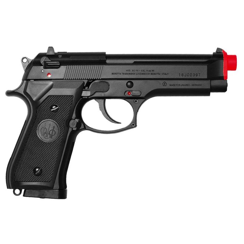 A Beretta 92FS da Umarex dispara BBs .20g a uma velocidade de 410fps - 125m/s ou BBs .25g a uma velocidade de 360fps ~ 110m/s.
