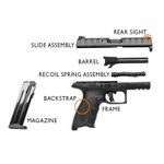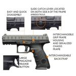 Alças traseiras ergonômicas e modulares O cabo ergonômico promove uma mira rápida e instintiva, com um ângulo de inclinação ideal. A parte traseira superior do cabo é caracterizada por uma área curva e levemente rebaixada para melhor acomodar e proteger a mão do atirador. A alça é serrilhada para oferecer um aperto antiderrapante. Graças ao novo sistema modular, com 3 backbones intercambiáveis, o APX é adaptável a todos os tamanhos de mãos.