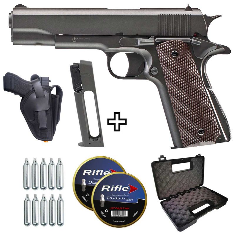 A Pistola Chumbinho 1911 KWC CO2 Slide Metal 4,5mm + Magazine + Coldre dispara no modo Semi Automática com velocidade de 345fps - 105m/s e energia de 1 Joules Ver mais