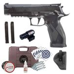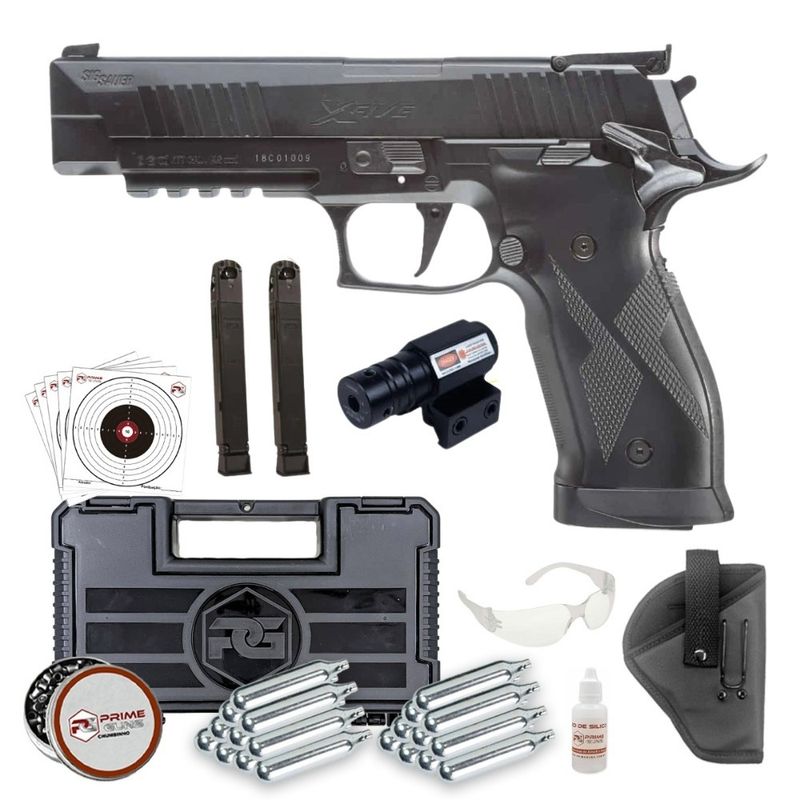 O pacote inclui a pistola Sig Sauer X-Five CO2 no calibre 4,5mm Diabolo e um manual ilustrado para facilitar o uso.