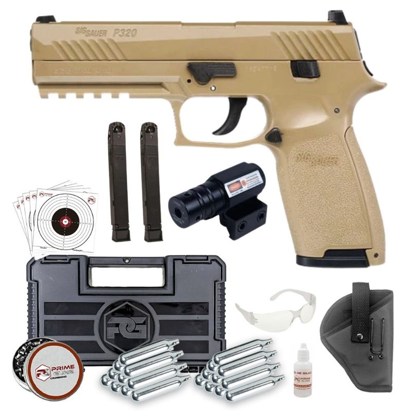 A Pistola Chumbinho Sig Sauer P320 TAN Co2 Blowback SuperKit dispara no modo Semi Automática com velocidade de 430fps - 130m/s e energia de 4,3 Joules Ver mais