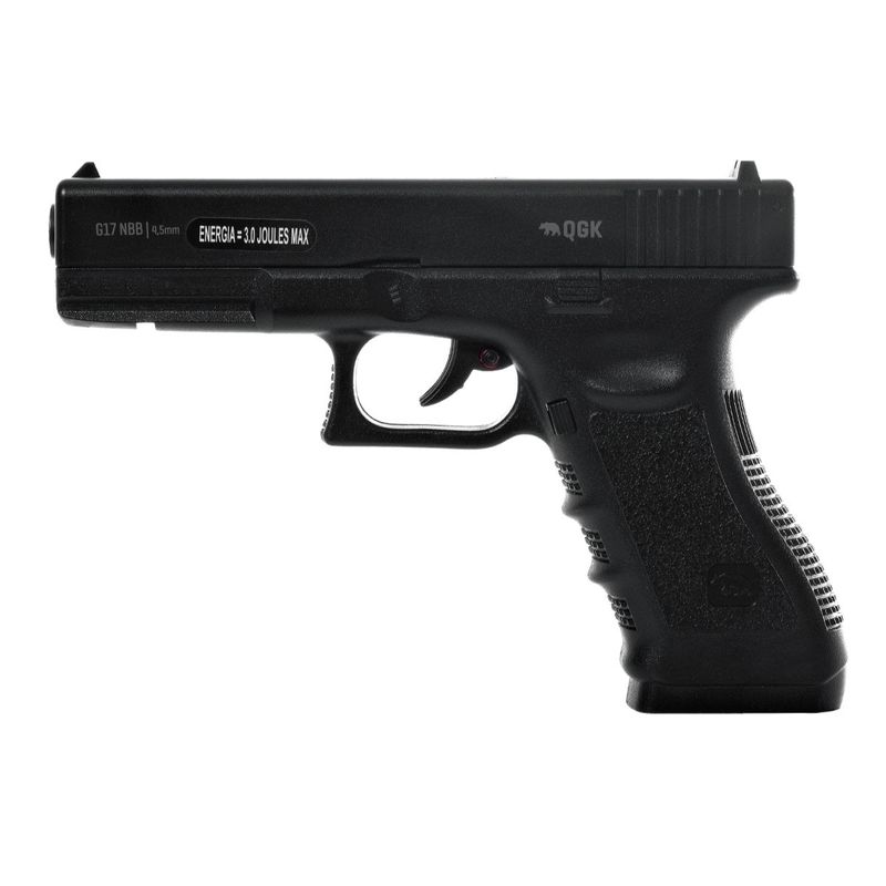 A pistola Glock QGK K17 é uma excelente réplica da pistola Glock 17 Gen 4. Esta versão da pistola airgun é fabricada toda em polímero, com partes internas em metal, e dispara esferas de aço 4,5mm.
