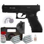A Pistola Co2 QGK G17 Glock 4,5mm NBB Polímero Super Kit dispara no modo Semi Automática com velocidade de 350fps - 106m/s e energia de 2,1 Joules Ver mais