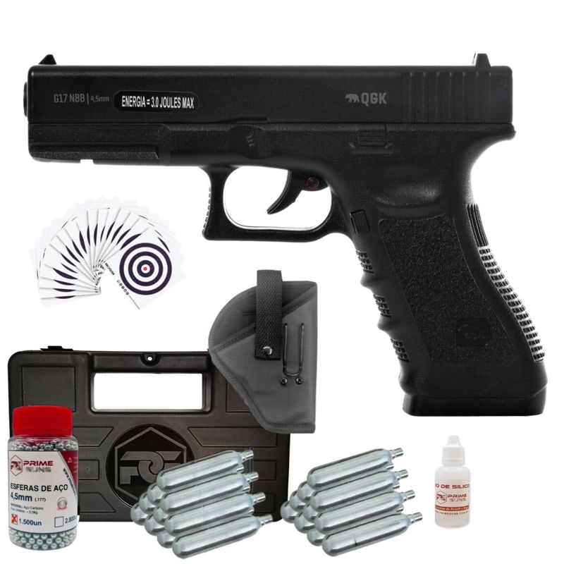 A Glock 17 (QGK 17) oferece energia de 2,1 Joules, ideal para treinos e tiros precisos até 15 metros.