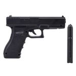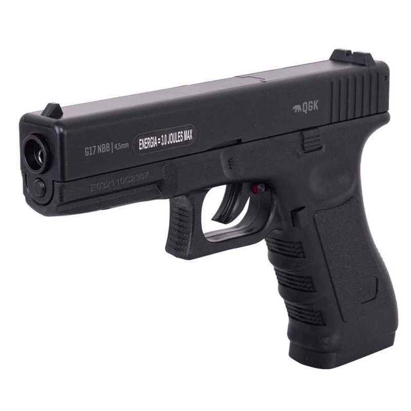 A pistola Glock QGK K17 é uma excelente réplica da pistola Glock 17 Gen 4. Esta versão da pistola airgun é fabricada toda em polímero, com partes internas em metal, e dispara esferas de aço 4,5mm.