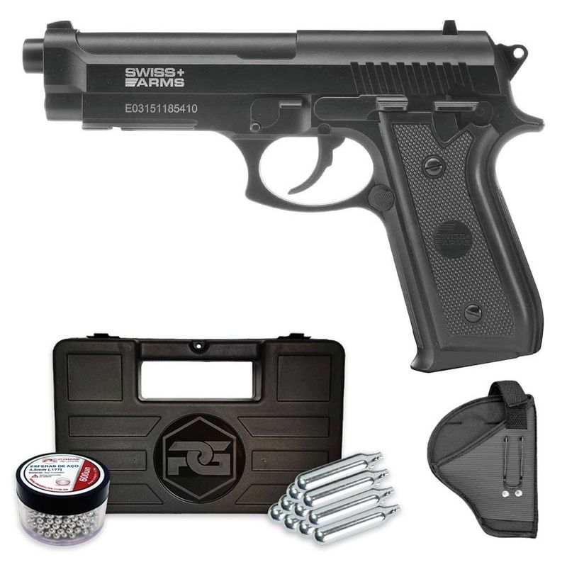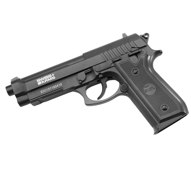 A pistola de ar Swiss Arms SA P92 CO2 vem como uma réplica pesada totalmente em metal no calibre 4,5 mm BB. O slide fixo garante menor consumo de CO2, até 150 tiros podem ser disparados por cápsula de CO2.