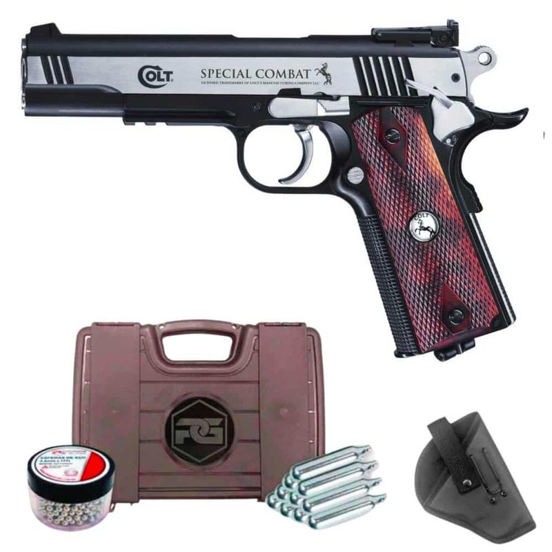 A Pistola Colt Special Combat 1911 Airgun 4,5mm Co2 + Coldre dispara no modo Semi Automática com velocidade de 420fps - 128m/s e energia de 3,2 Joules Ver mais