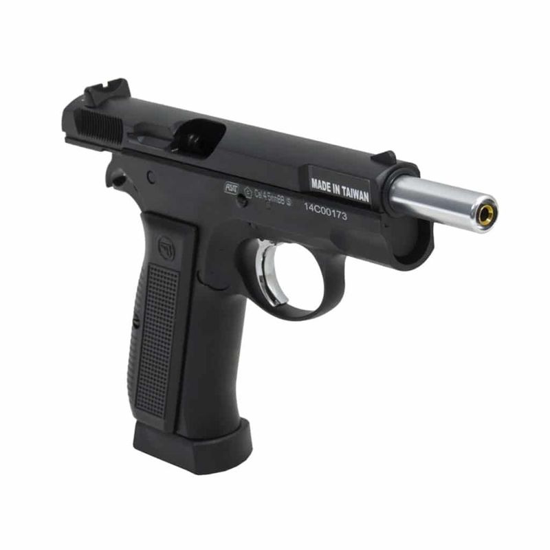 Com uma capacidade para 17 esferas de aço 4,5mm, a CZ75 possui travas funcionais que mantêm o ferrolho aberto quando a munição acaba.
