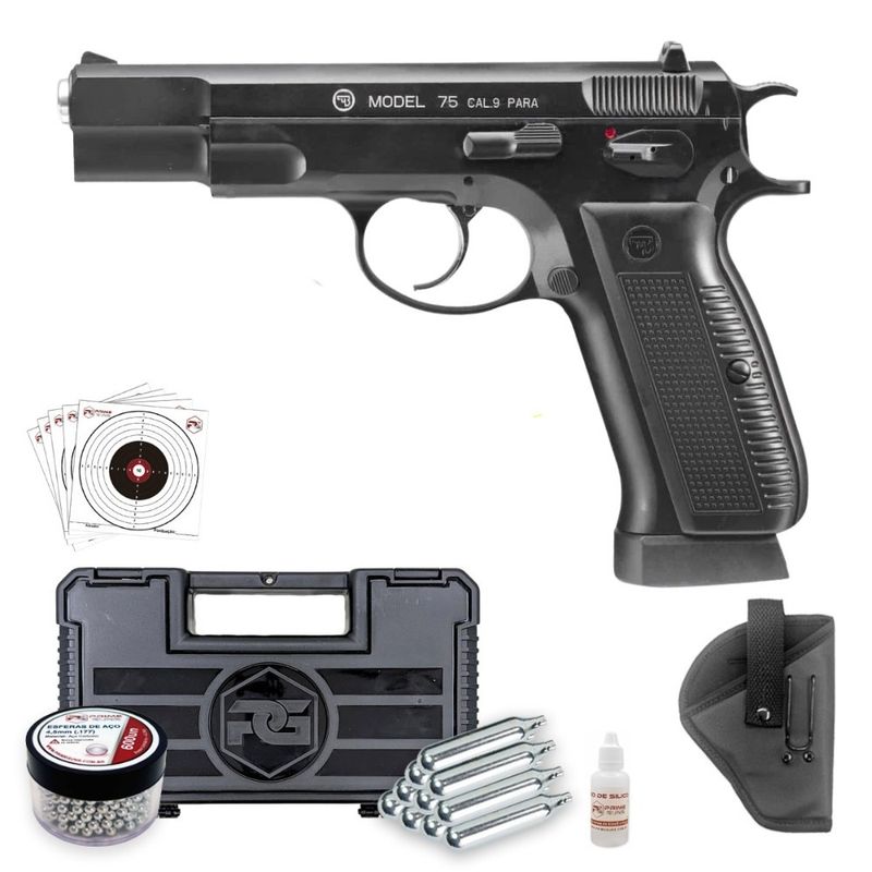 A Pistola CZ75 ASG Airgun Blowback Metal 4,5mm Co2 Coldre dispara no modo Semi Automática com velocidade de 328fps - 100m/s e energia de 1,6 Joules Ver mais
