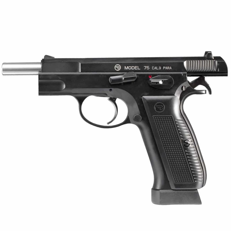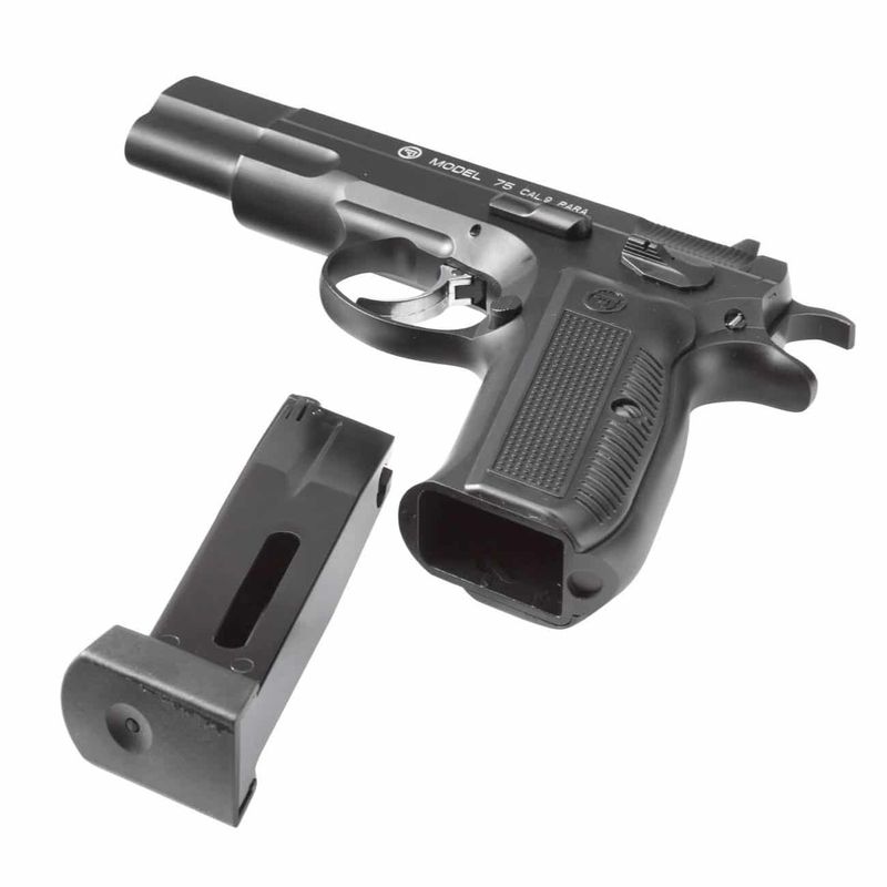 Com uma capacidade para 17 esferas de aço 4,5mm, a CZ75 possui travas funcionais que mantêm o ferrolho aberto quando a munição acaba.