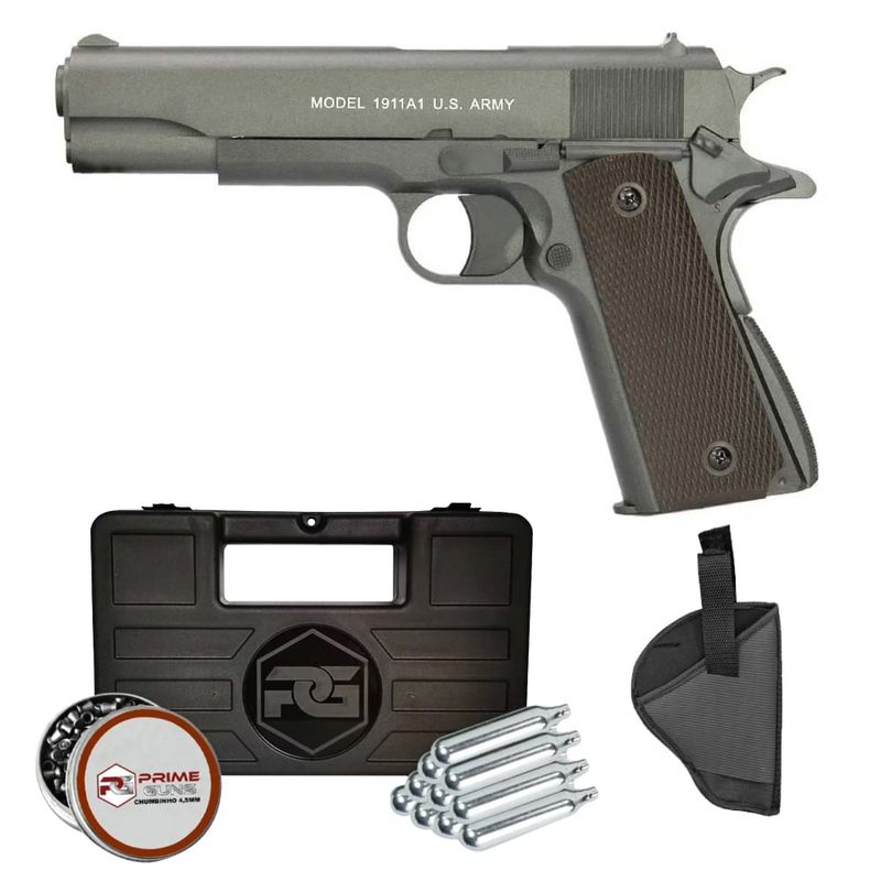 A Pistola de Chumbinho 1911 A1 Colt CO2 Slide Metal 4,5mm + Coldre dispara no modo Semi Automática com velocidade de 350fps - 110m/s e energia de 3 Joules Ver mais