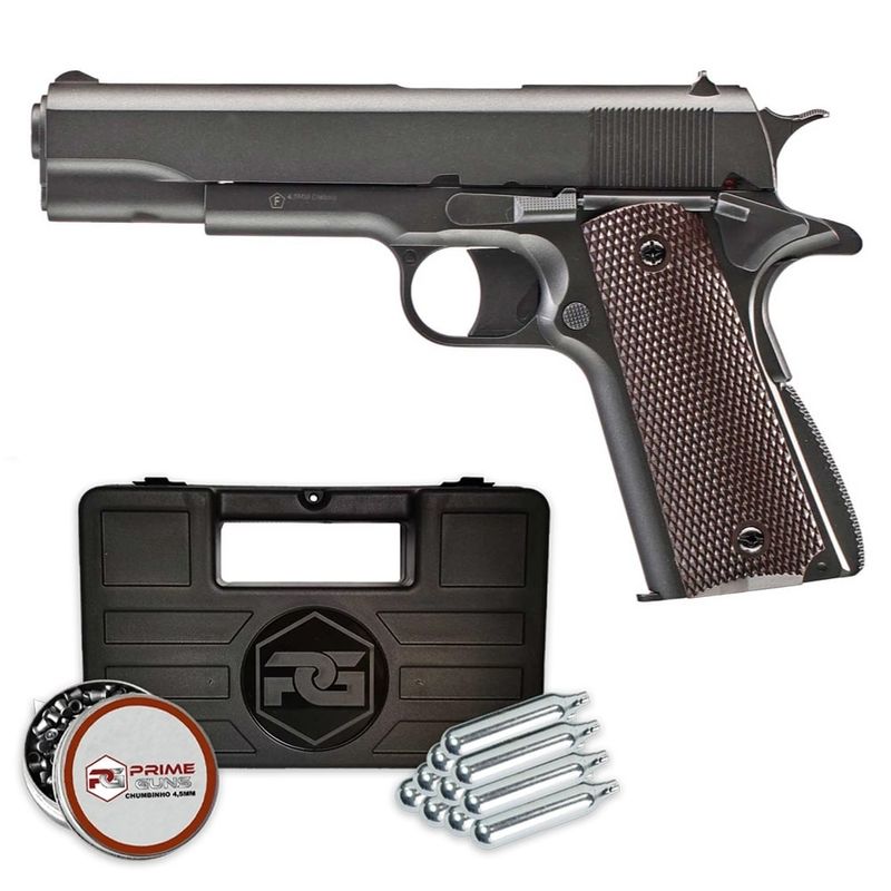 Kit completo: + Pistola Colt 1911 CO2 Slide Metal + 10 Cilindros de CO2 12g + 500 Chumbinhos + 1 Maleta rígida Prime Guns