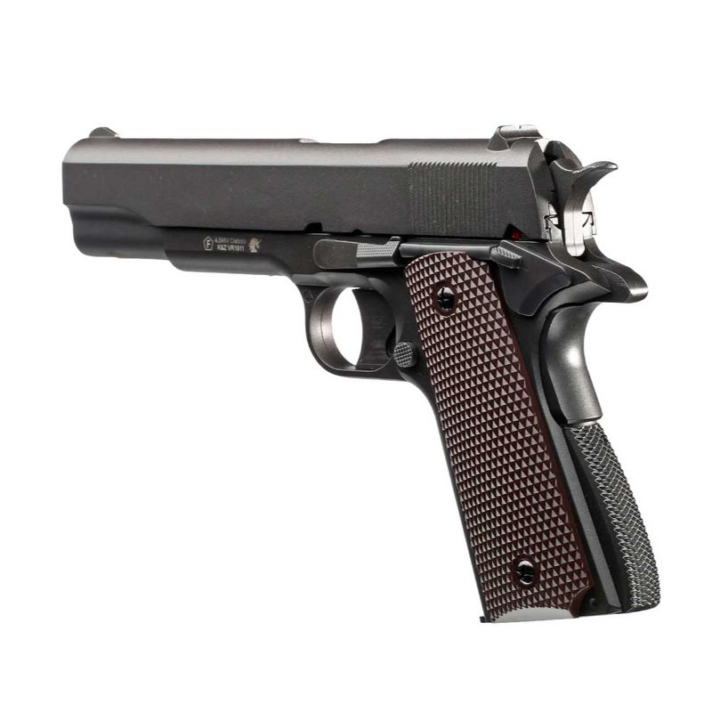 A lendária Colt M1911, uma das pistolas mais famosas da história, chega em sua versão Airgun CO2 fabricada pela KWC, com excelente realismo e desempenho. O modelo segue a mesma plataforma da 1911 VALOR licenciada pela Dan Wesson, inclusive sendo produzido pela mesma fabricante.