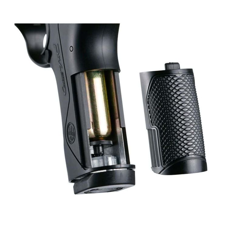 A Umarex Beretta PX4 Storm dispara chumbinhos calibre 4,5mm, também conhecidos como calibre .177, amplamente disponíveis no mercado. É alimentada por cartuchos de CO2 de 12g, inseridos no grip da pistola, o que torna os disparos mais suaves e aumenta a conveniência para sessões de tiro prolongadas.