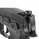 A mira com 3 pontos brancos, o trilho Picatinny 1913 para acessórios e o número de série individual fazem desta pistola uma réplica fiel e funcional da versão de fogo.